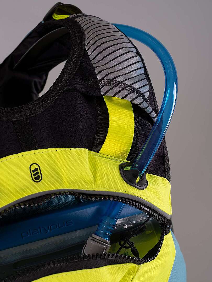 Regolazione di spallacci, fianchi e vita. Chiusura con robusta cerniera in nylon, possibilità d’utilizzo con zip aperta e chiusura con sole due clip, per una migliore areazione interna, collo e spallacci in neoprene, per evitare abrasioni della pelle. Inserti riflettenti su spalle, anteriori e posteriori, tasca per lampada di segnalazione anteriore, tasca posteriore per lampada o bottiglia, tasca per camel back posteriore, con guida tubo su spallaccio, due tasche anteriori come rete e chiusura zip, con fischietto e moschettone, scaldamani.