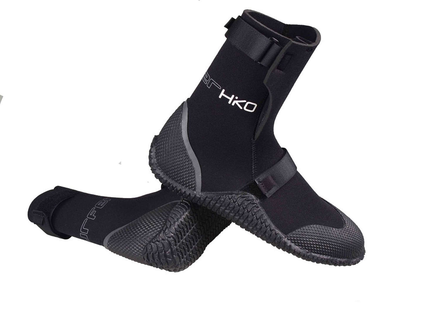Hiko Surfer, stivaletto in neoprene 2mm, con rinforzo sul tallone e due straps alto e basso che impediscono allo stivaletto di sfilarsi nel nuoto in corrente , soletta in gomma scolpita, con ottimo grip, per una migliore protezione del piede, ma senza perdita di sensibilità nel controllo del kayak.