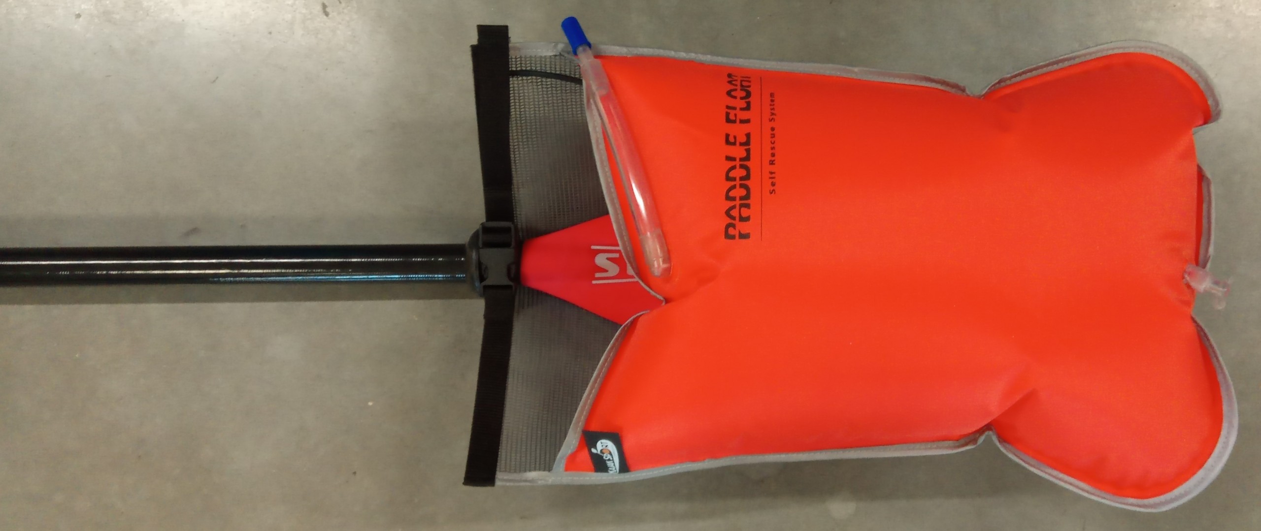 KS Paddle Float, prodotto dalla Kajak Sport, molto robusto, completo di tubo di gonfiaggio e valvola di scarico separati, tasca per la pala della pagaia con rete posteriore e cinghiolo di bloccaggio del manico, cavo elastico con moschettone per assicurare il Paddle Float.