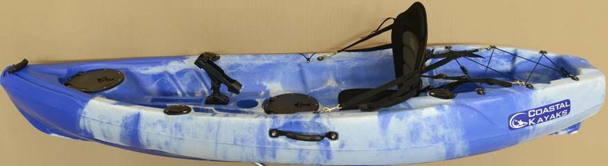 Top Fishermann, Sit on Top kayak autosvuotante, con allestimento specifico per la pesca. Dotato di un portacanna orientabile e di quattro fissi, fermapagaia, sedile con poggiaschiena, gavoncino portaesche, gavoncino stagno per documenti e varie, vano posteriore portaoggetti o per sacca stagna, tappi di chiusura del sistema di autosvuotamento acqua, maniglie di trasporto in poppa e prua e due laterali. Kayak molto stabile, facile da condurre, dotato di fianchi alti per respingere gli spruzzi e con marcata chigliatura dello scafo per mantenere la direzione.